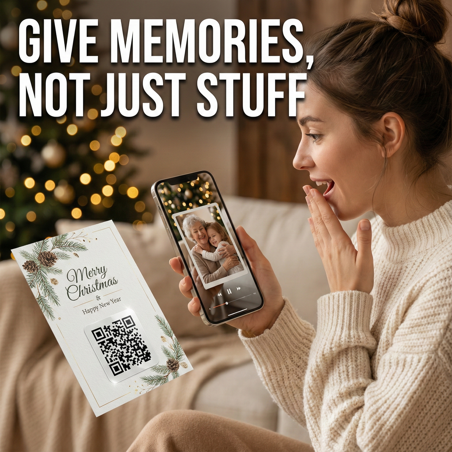 Why give just a physical object when you can attach a memory? Simply peel and stick a video code onto any gift box, card, or package. Record a personal message, share a funny moment, or send a warm hug. Watch their jaw drop when the wrapping paper comes to life