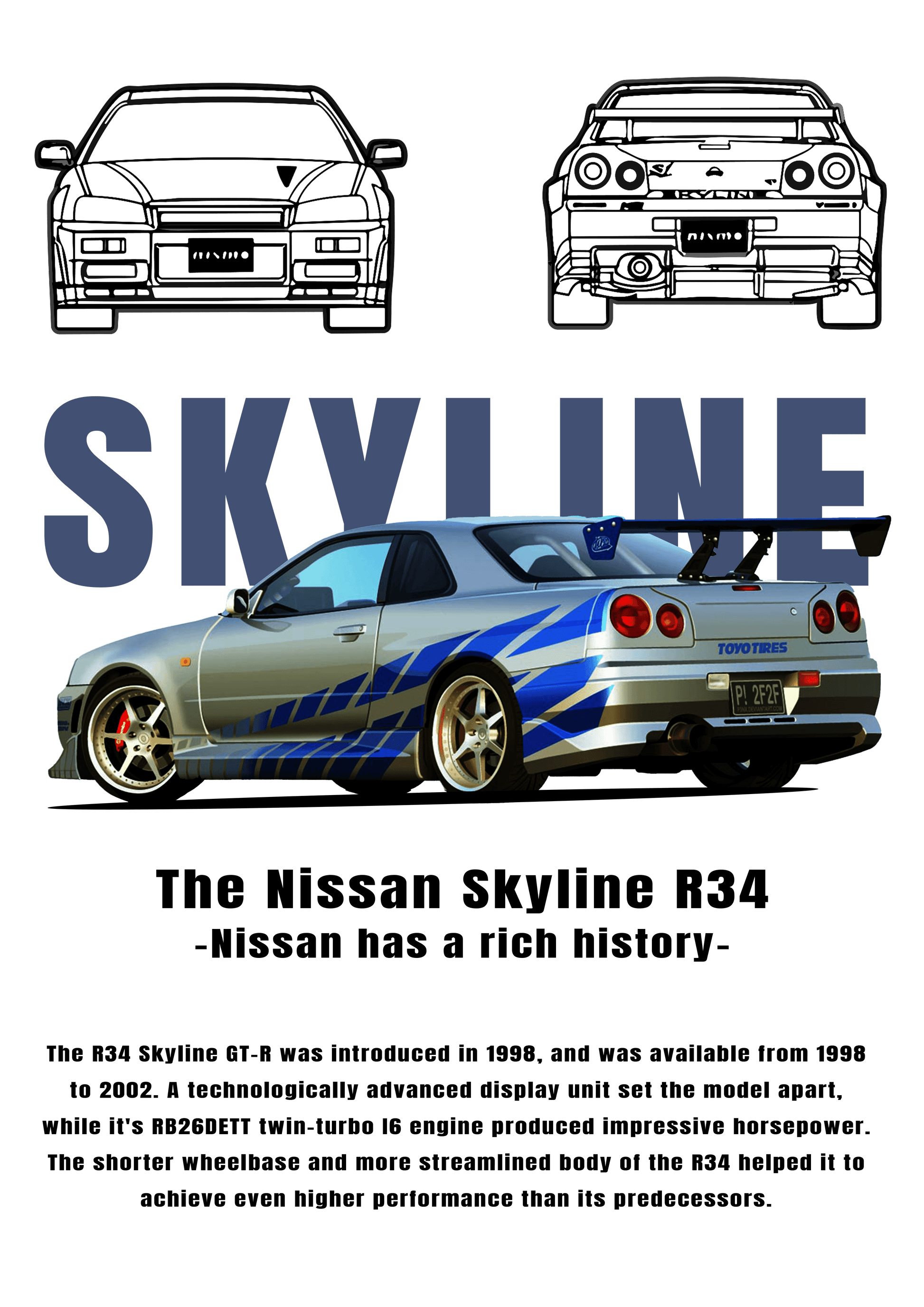 Nissan Skyline R34 Graphic T-Shirt — Skyline Text & Street Car Poster