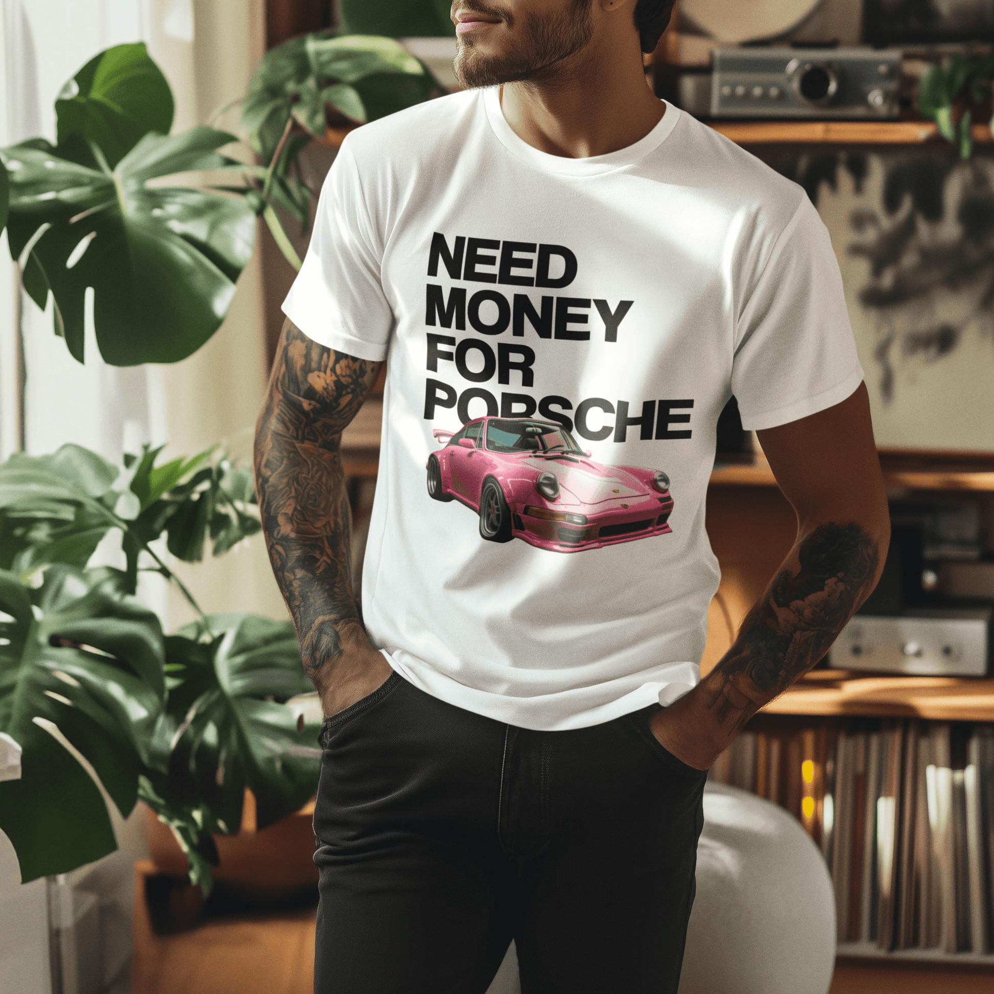 Premium 100% cotton graphic tee featuring a slammed pink Porsche 911 GT2 with the bold slogan “NEED MONEY FOR PORSCHE”. High-contrast meme-style layout on a black background with big block lettering.