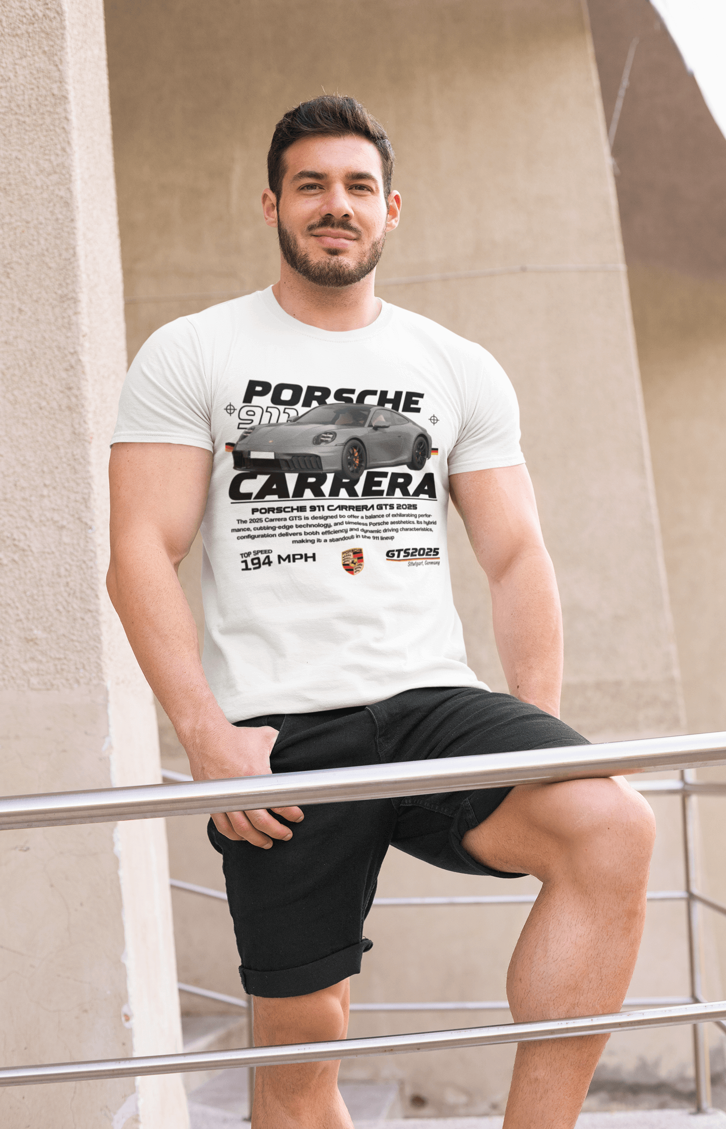 Premium 100% cotton graphic tee inspired by the Porsche 911 Carrera GTS. Unisex fit and long-lasting DTG print. Choose print placement (front or back), multiple colors and sizes.