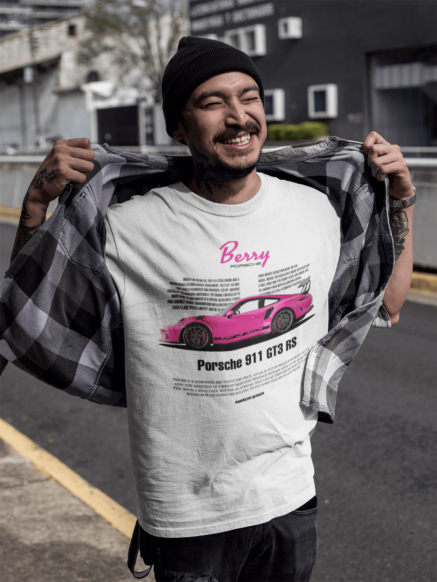 Premium 100% cotton graphic tee featuring a bright pink Porsche 911 GT3 RS “Berry” edition side profile with magazine-style typography and spec text. Clean poster layout on the chest makes this shirt stand out in any Porsche collection.
