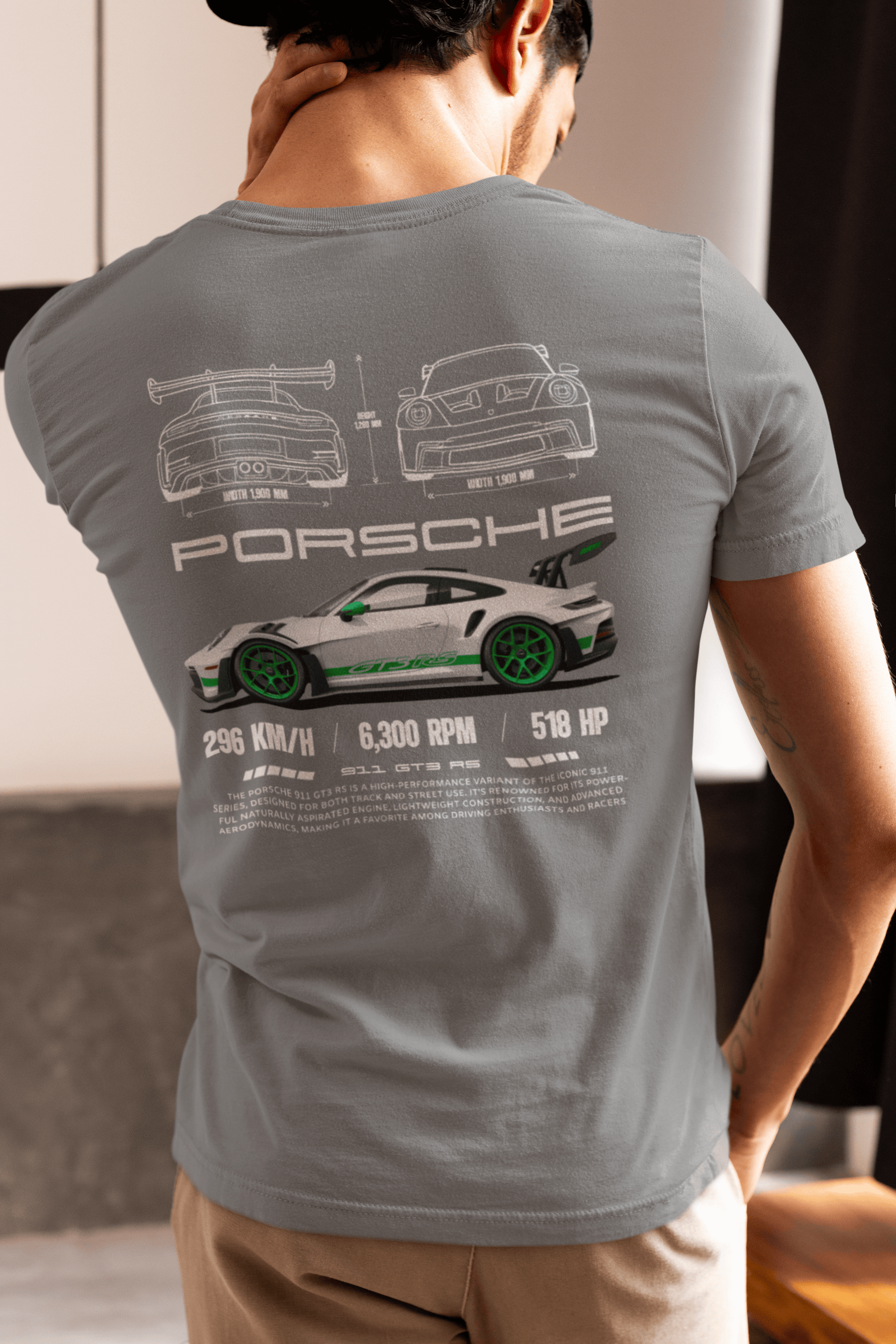 Premium 100% cotton graphic tee featuring a white Porsche 911 GT3 RS with bright green wheels and GT3 RS side graphics. The layout combines blueprint-style front and rear outlines with a detailed side view plus performance stats (296 km/h, 6,300 rpm, 518 hp) for a technical poster look.