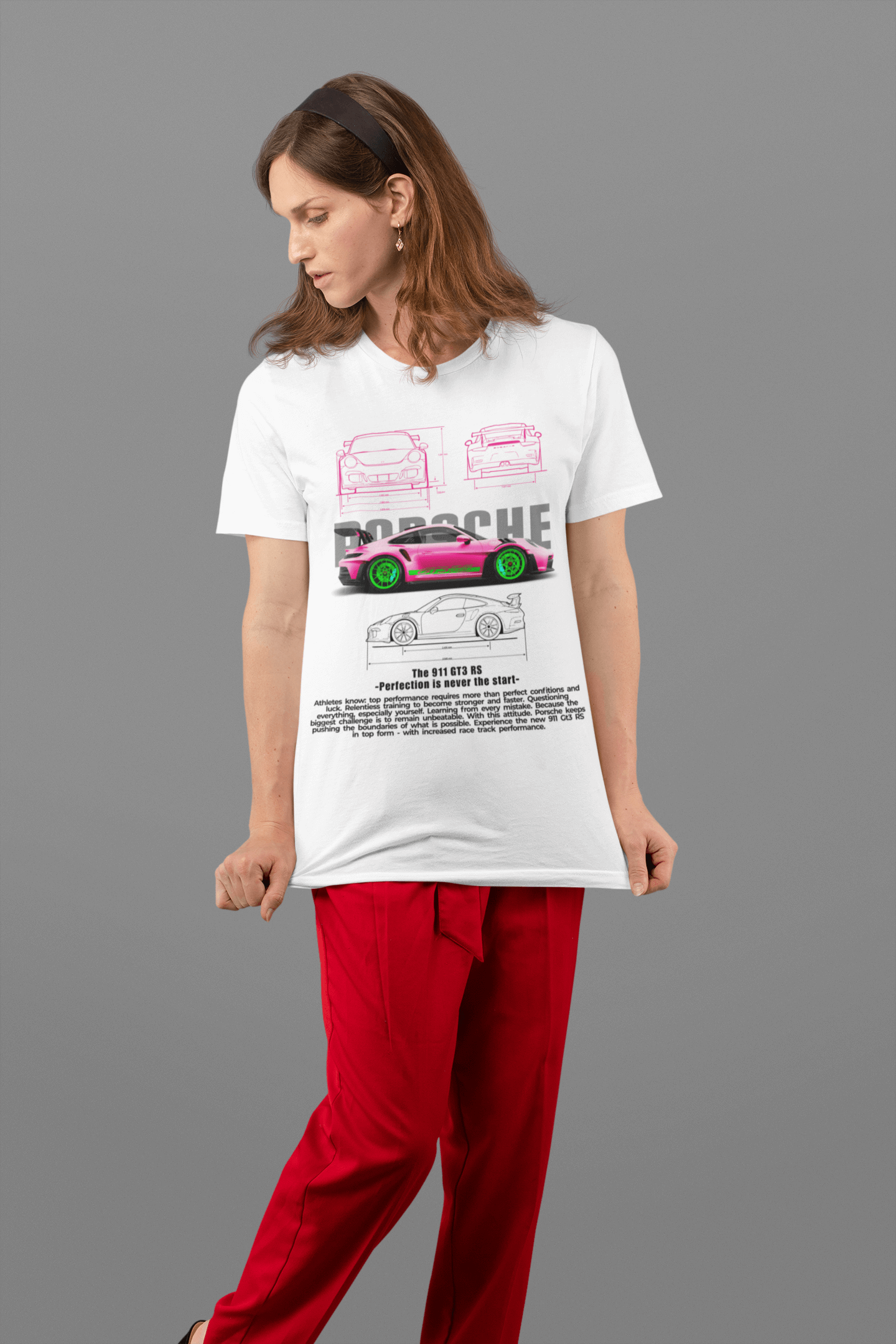Front print shows a hot-pink 911 GT3 RS with bright green wheels, sketch views and racing-inspired typography.