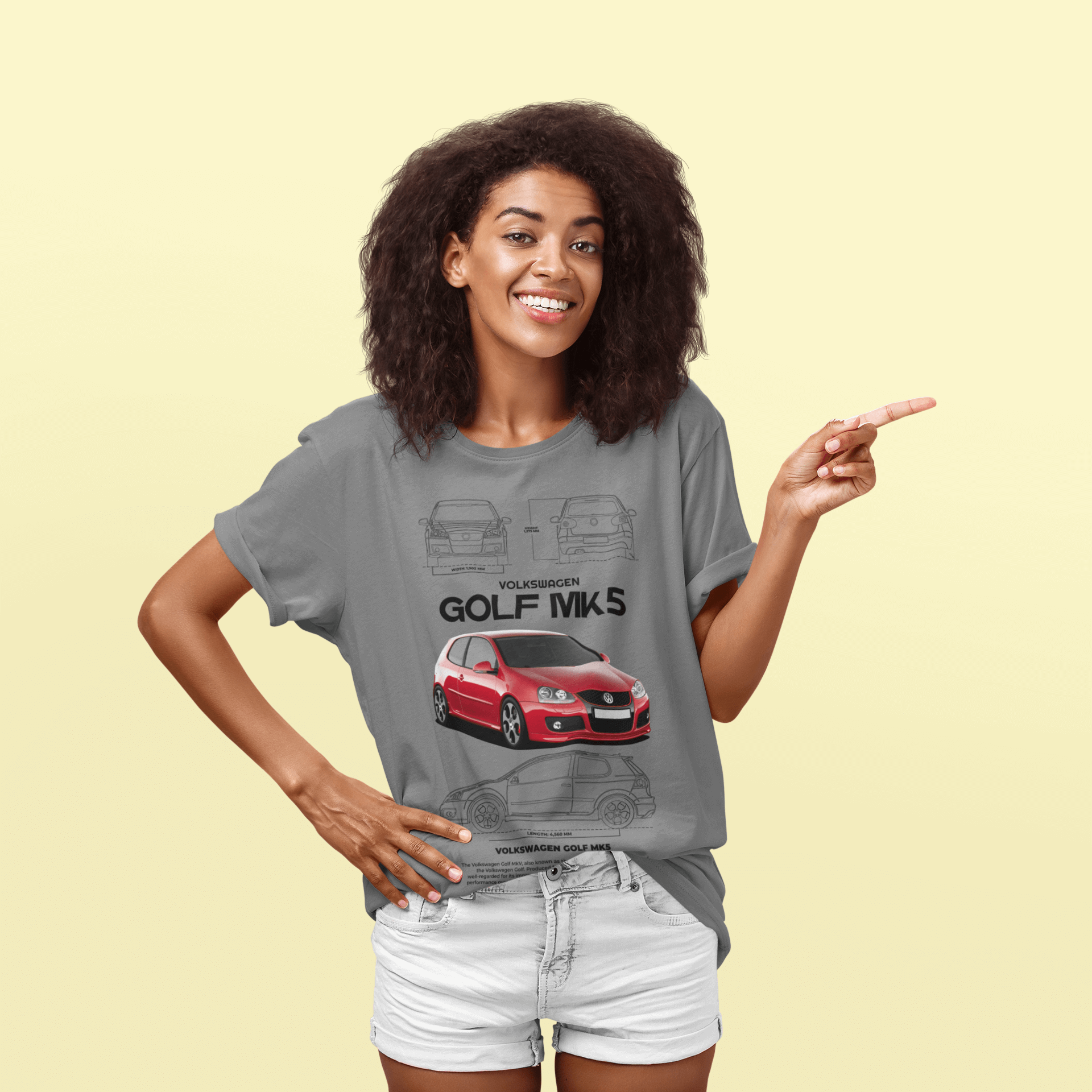 Premium 100% cotton graphic tee inspired by the fifth-generation Volkswagen Golf MK5 hot hatch, featuring front, rear and side outline views with dimensions and a bold red 3/4 photo on a dark background. Unisex fit and long-lasting DTG print. Choose print placement (front or back), multiple colors and sizes.